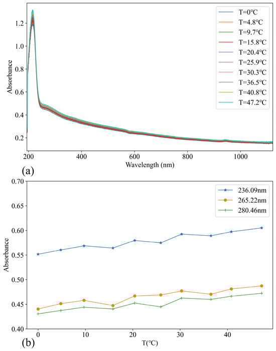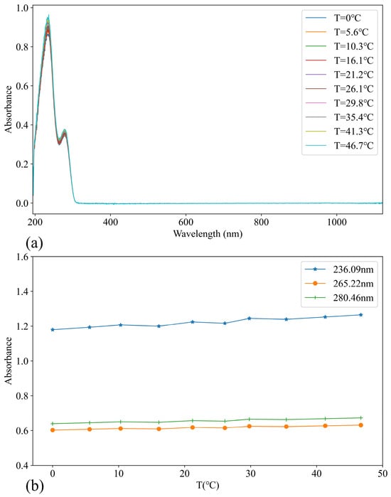 The same 50 mg/L potassium hydrogen phthalate standard solution was prepared as that used in Section 3.1.1. The temperature of the solution was adjusted from 0 to 46.7 °C using a temperature-controlled chamber and ice. The UV-Vis spectra of these solutions are illustrated in Figure 5a. The absorbance curves of the characteristic peaks and valleys (as identified in the COD standard solution) at different temperature ranges are illustrated in Figure 5b.