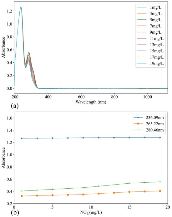 The analysis of real water samples, as shown in Figure 8a, reveals that nitrate () exhibits a distinct absorption peak at around 280 nm, which overlaps with one of the absorption peaks of the COD standard solution. There is minimal absorption at the first absorption peak of the COD at 236.09 nm. The absorbance at 280 nm increases by approximately 0.17 as the concentration increases from 1 to 19 mg/L. Furthermore, the absorbance generally increases with the rise in concentration (except for 236.09 nm), displaying a strong linear relationship, as shown in Figure 8b. However, the linearity of the absorbance at different wavelengths is inconsistent. Thus, significantly influences the UV-Vis spectroscopy, requiring the use of compensation methods to reduce this influence in COD detection based on UV-Vis spectroscopy.