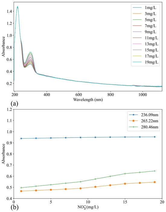 The composition of real water samples is far more complex than that of standard solutions. Therefore, in this section, we continue to focus on the lake water sample with a COD concentration of 50.2 mg/L, as discussed in Section 3.1.1. The nitrate () concentration in this water sample was adjusted from 0 to 19 mg/L. The UV-Vis spectra of these water samples are illustrated in Figure 8a. The absorbance curves at the characteristic peaks and valleys (as identified in the COD standard solution) for different NaNO3 concentrations are illustrated in Figure 8b.