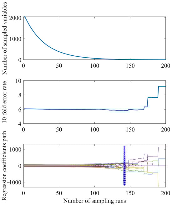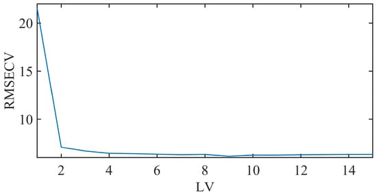 Firstly, the Stability Competitive Adaptive Reweighted Sampling (SCARS) algorithm is employed to extract features from the original spectral data. It is crucial to determine the optimal number of latent variables (LVs) for the PLS model in order to effectively filter the feature wavelengths using the SCARS algorithm. The initial maximum LV score for the PLS model is set to 15, and although the Monte Carlo sample count is set to 3000, this is not strictly necessary. The root mean square error of cross-validation (RMSECV) for PLS models across different LV values is illustrated in Figure 10. The minimum RMSECV value of 6.2604 occurs when the LV is nine, indicating that the optimal number of LVs for the PLS model is nine.