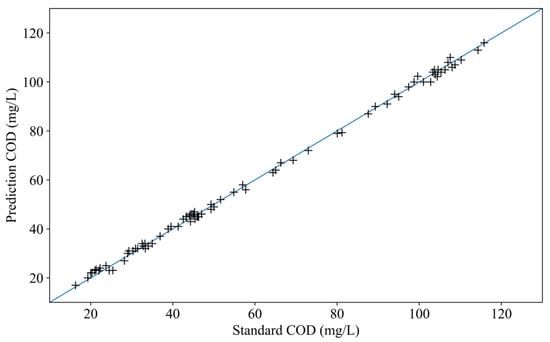 The weighted superposition of three environmental factors (WSTEFs) was taken as one factor . It was fused as the 15th dimension feature with the 14 features extracted by SCARS. The PLS model was established by the fusion of spectral features and WSTEF, and better COD detection accuracy was obtained. The of the model reached 0.9714, and RMSEC reached 2.19. The reached 0.9602, and RMSEP reached 3.52. The prediction results and standard value scatter plot of the COD prediction model based on SCARS+ WSTEF +PLS for the prediction set are shown in Figure 12. There is good consistency between the predicted values and the standard values.