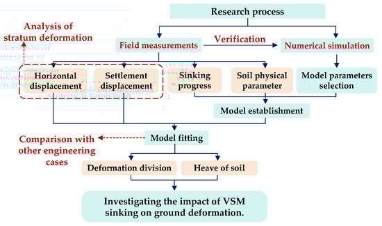 Currently, the deformation pattern of the surrounding soil during the sinking of the VSM in soft soils remains ambiguous. Therefore, this study systematically analyzed the impact of the new VSM technology on the deformation behavior of soft soils on the basis of the VSM construction project in soft soil areas and integrated monitoring data and the Plaxis3D 24.1 software. The research process is shown in Figure 1. Additionally, a soil impact zoning method based on deformation characteristics, which divides the surrounding area of the shaft, is proposed. The zoning results are discussed in terms of their guidance for construction optimization and environmental protection. This study provides not only important references for controlling ground deformation during shaft construction in soft soil areas but also scientific support for construction safety management and environmental protection measures in complex urban underground engineering projects.