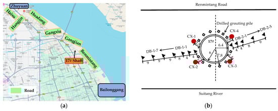 Location and measurement point layout of 17# shaft: (a) geographic location of the shaft and (b) Schematic of the shaft measurement point layout (unit: m).