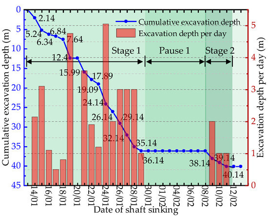 The shaft sinking process can be divided into two main stages. In Stage 1 (from January 14 to 29), the shaft sank to a depth of 36.14 m, with an overall sinking rate of approximately 2.12 m per day. Owing to the construction pause during the Chinese New Year holiday (from January 30 to February 8), the consolidation of the soil at the pit bottom occurred, resulting in a reduced sinking rate during Stage 2 (from February 9 to 11), with the sinking rate slowing to approximately 1.67 m per day.