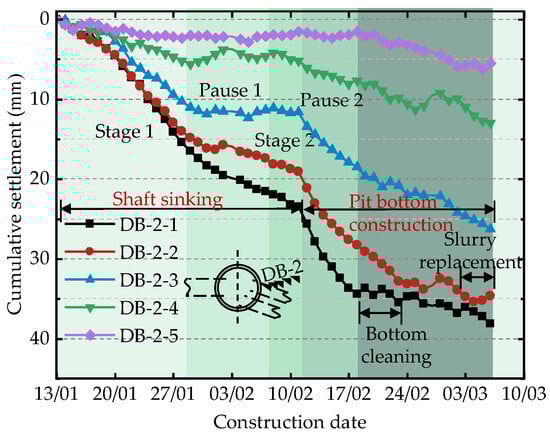 The cumulative surface settlement variations at the five monitoring points of DB-2 are shown in Figure 6. After the shaft construction (including slurry replacement for the sidewalls) was completed, the maximum settlement recorded at the monitoring points reached 37.23 mm. During the first construction pause (January 30 to February 8) and the second pause (February 12 to 17), soil settlement exhibited continuous growth, with settlement increments of 5.9 mm and 8.0 mm, respectively. This behavior is attributed to the rheological properties of soft soils in Shanghai, which increase the time-dependent effects of excavation-induced disturbances, resulting in continuous settlement under unchanged stress conditions [26]. Soft clay in the excavation area exhibits pronounced creep behavior over time [27,28,29,30].