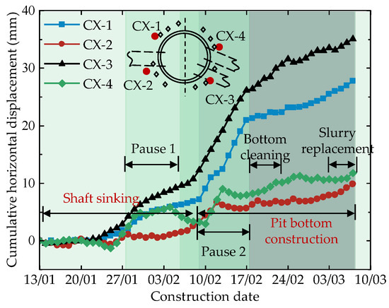 Figure 7 shows the cumulative development curves of horizontal displacement at a depth of 40 m for each monitoring point. The monitoring point CX-2, which was the farthest from the shaft, exhibited the smallest cumulative horizontal displacement at 9.86 mm. In contrast, CX-3, the closest to the shaft, experienced the largest cumulative displacement, reaching 33.77 mm after construction was completed. During the first construction pause and second construction pause, the cumulative horizontal displacement at CX-3 increased by 4.48 mm and 10.86 mm, respectively, accounting for 13.26% and 32.16%, respectively, of the total displacement. The monitoring results at CX-1 displayed a trend similar to those at CX-3, whereas at CX-2 and CX-4, the rate of horizontal displacement growth significantly slowed during the two pause periods.