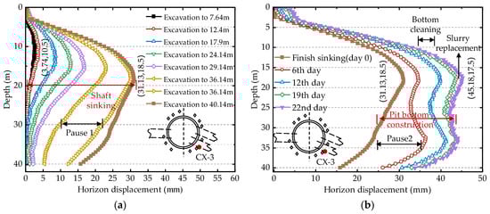 Horizontal displacement development curve for CX-3: (a) shaft sinking period and (b) pit bottom construction period.
