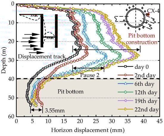 Given the large excavation depth of this shaft, particular attention should be given to controlling horizontal deformation. Therefore, point CX-4, which is located deeper, was selected to analyze the horizontal displacement of the surrounding soil. Figure 9 shows the development of horizontal displacement at CX-4 during the pit bottom construction period. Excessive horizontal displacement was observed in the portion below the excavation bottom. During shaft construction in soft soil areas, as the soil is excavated layer by layer, the soil stress is gradually released, triggering horizontal displacement. Owing to the weakening of the shaft bottom support, localized displacements occurred in the soil at the edge of the shaft bottom.