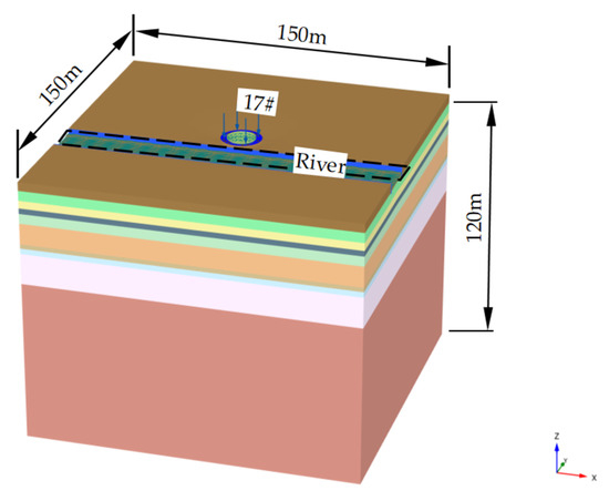 Figure 10 shows a schematic of the finite element model. The overall water level in the model was –3 m. To eliminate boundary effects, the dimensions of the soil model were 150 m × 150 m × 120 m [32].