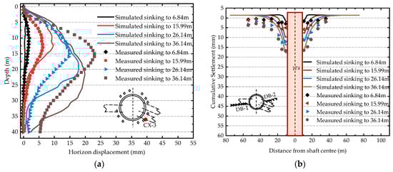 Validation of the calculated results: (a) horizontal displacement comparison and (b) ground settlement comparison.