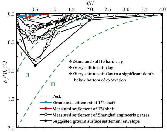 A surface settlement envelope was established on the basis of the numerical simulation results and actual measured data and compared with previous research [36], as shown in Figure 12. The horizontal axis represents the ratio of the distance (d) from a point behind the support structure to the sinking depth (H) of the shaft, whereas the vertical axis represents the nondimensional surface settlement. During the sinking of the VSM, the surface settlement around the shaft exhibits a concave shape. The settlement envelope obtained from the numerical simulation results is similar in shape and trend to the measured data, indicating that the HSS constitutive model can accurately reflect the disturbance of the surrounding soil during the VSM sinking process. However, owing to the time-dependent characteristics of soft soil, slight discrepancies exist in the results.
