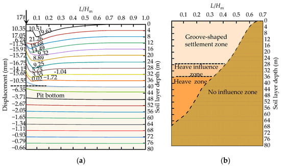 Vertical deformation of the soil behind the shaft at a depth of 40.14 m and the delineation of the affected area: (a) vertical displacement distribution curve; (b) influence zoning.