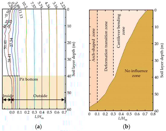 Figure 14a shows the distribution curves of horizontal displacement in the soil at different distances, with displacement values represented numerically, where positive values indicate displacement towards the excavation. When the shaft sinks to Hm = 40.14 m, the horizontal displacement of the soil decreases gradually as the distance from the shaft increases. On the basis of the pattern of soil layer changes, the soil outside the shaft is divided into three zones: the arch-shaped zone, the deformation transition zone, and the cantilever bending zone, as shown in Figure 14b.