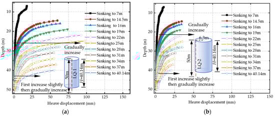 Vertical distribution of soil heave at the center and edge of the shaft: (a) shaft central axis LQ-1 and (b) vertical axis of shaft side LQ-2.