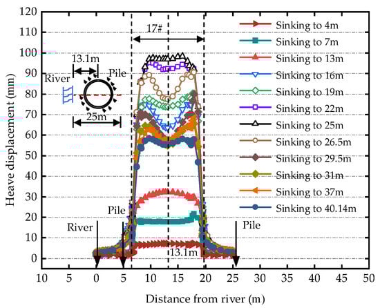To explore the soil heave patterns at different excavation depths during shaft sinking, the heave values of the soil within a 25-metre range along the vertical axis of the shaft perpendicular to the river channel were analyzed, as shown in Figure 17. The heave values within the shaft area are relatively large, whereas those at the two sides are smaller. The overall heave trend within the shaft changes from a single-peak “convex” shape to a double-peak “concave” shape. When the shaft reaches the middle depth (0.4 Hm to 0.7 Hm), the soil layers are primarily soft clay, and significant heave occurs at the pit bottom. During the shaft sinking process, when the excavation depth increases rapidly or approaches key soil layers, stress redistribution in the soil triggers significant displacement changes. This variation reflects the nonlinear response of the soil to unloading. During the early stages of shaft sinking, shallow soils are effectively controlled by the active reinforcement of the support system. However, as the excavation depth increases, deeper soils gradually experience the direct effects of stress release, resulting in greater heave or settlement. This phenomenon reflects the differing responses of various soil layers to unloading, with the disturbance effects of construction amplifying the deformation of deeper soils as excavation approaches critical layers, further influencing the overall settlement pattern. This finding also validates the transition in the overall heave trend during shaft sinking, with larger heave values observed when the soft clay layers in the middle section are reached.