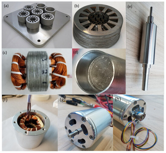 Motor assembly production: (a) SLM-printed stators and cylinders for AC/DC magnetic properties studies; (b) EDM-sliced stator laminates with a thickness of 1.4 mm; (c) assembled stator winding; (d) rotor with the BAAM-printed NdFeB-PPS magnet; (e) assembled rotor; (f) rotor in housing; and (g,h) fully fabricated motor.