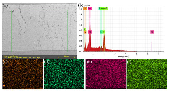 (a) SEM microstructure along the build direction used for elemental characterization in EDX, (b) corresponding EDX spectra, (c) C mapping, (d) Si mapping, (e) Fe mapping, and (f) Ir mapping used to avoid the charging problem.