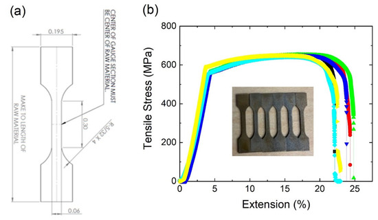 (a) ORNL SS-3 standard sample specification with a thickness of 0.03 in. for the samples shown in the inset of (b); and (b) tensile properties of SLM-printed Fe-3Si. Color represents the data for different samples.
