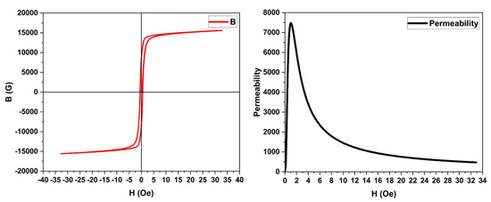 The magnetic hysteresis loops were measured for the ring samples magnetized up to a low-magnitude DC applied field of approximately 32 Oe, as shown in Figure 6 (left). The corresponding low-field, DC-relative permeability is presented in Figure 6 (right). The coercivity is approximately 0.5 Oe, which is within the range of conventional laminations (25 to 50 A/m, or 0.314 to 0.628 Oe). Again, note that Figure 6 (left) is the low-field magnetization hysteresis loop of the material.