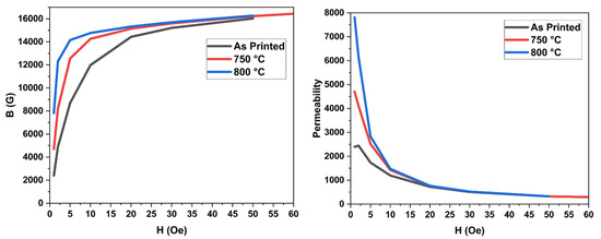 Effect of heat treatment on the magnetic induction (left) and relative permeability (right) of the as-printed and heat-treated Fe-3Si laminates; the Higher the annealing temperature, the higher the B or permeability values.