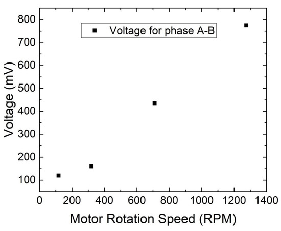 The assembled motor was run for back EMF (BEMF) testing where the motor ran without any excitation current when it could be considered performing as an electric generator. In other words, the BEMF zero load condition of the electric motor where induction on stator coils is only due to the magnetic fields of permanent magnets inserted in the rotor. Figure 8 shows the measured BEMF for the assembled brushless permanent magnet motor which reached up to 900 mV at 1400 rpm.