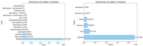 DoS GoldenEye, DoS Hulk, DoS Slowhttptest, and DoS Slowloris in (left) were merged into a single category labeled “DoS”. Similarly, FTP-Patator and SSH-Patator were combined into the “Brute Force” category, and web attack—brute force, web attack—XSS, and web attack—SQL Injection were grouped under “Web Attack”. This resulted in six traffic types, as shown in (right).