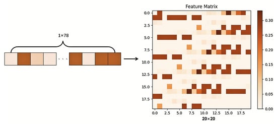 The 1 × 78 one-dimensional feature vector is replicated five times and concatenated to form a 1 × 390 one-dimensional feature vector. This is then transformed into a 20 × 20 feature matrix, with any remaining positions filled with zeros.