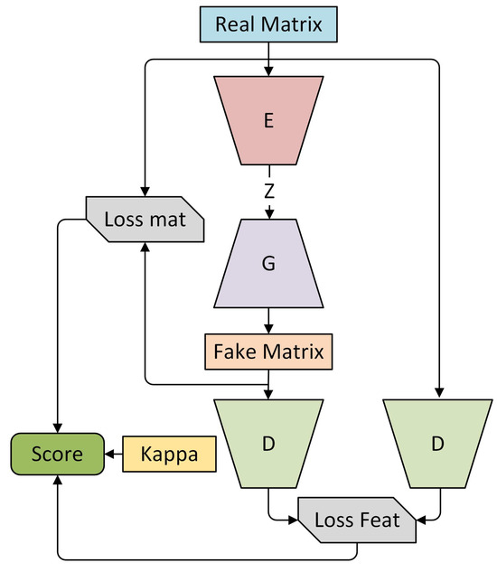 where is the loss between the real data and the generated data, represents the loss between the discriminator’s evaluation results of the real data and the generated data, and is the total loss of the encoder, which also serves as the final detection score of the entire algorithm model. is a hyperparameter controlling the importance of ; in this study, it is set to 0.9.