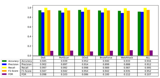Our algorithm model is constructed based on normal traffic data and cannot specifically identify individual attack types during actual testing. Therefore, the experiment primarily uses a binary classification approach of “Normal” versus “Abnormal”. To further validate the model’s effectiveness, we conducted independent binary classification experiments for each of the five attack types shown in the Figure 8 (DoS, PortScan, DDoS, BruteForce, WebAttack) against normal traffic (Benign). Additionally, we combined these five attack types into a single “Anomalous” category and conducted an overall binary classification experiment against normal traffic. This experimental design allows for a comprehensive evaluation of the model’s performance in detecting normal traffic versus various types of anomalous traffic.