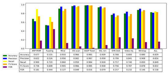 Specifically, while the model achieved good accuracy and recall across most attack categories in the Kitsune dataset, attacks like ARP MitM exhibited relatively higher FOR values, indicating a more noticeable issue with false negatives for these types. This points to the need for further refinement, especially in reducing the FOR and improving the precision for these more challenging attack scenarios. Moving forward, enhancing detection capability in these areas will be a primary focus, as we aim to achieve a more balanced performance across all metrics.