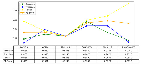 In Figure 10, we validate the effectiveness of our proposed algorithm by comparing it with several other intrusion detection algorithms related to the CIC-IDS2017 dataset, including DI-NIDS [26], M-CNN [27], Method [28], SGAN-IDS [29], and Method [30].
