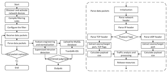 The system first discovers and activates network devices, setting up filters to capture network packets and process them individually. During packet parsing, the system extracts key information such as protocol type, source/target ports, and TCP/UDP flags, and calculates payload size. The parsed data then undergo feature engineering before being uploaded to the database. Finally, the TranGAN-IDS model performs intrusion detection, allowing for individual and combined detection outputs.