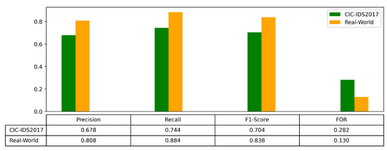 Based on the test results, we observe that on the CIC-IDS2017 dataset, the model achieved a precision of 0.678, recall of 0.744, F1-score of 0.704, and a FOR of 0.282. In contrast, when tested on real-world data, the model significantly improved with a precision of 0.808, recall of 0.884, F1-score of 0.838, and a reduced false positive rate of 0.130. These results demonstrate that the TransGAN-IDS model performs better on real-world data than on the CIC-IDS2017 dataset, highlighting its superior effectiveness and lower false positive rate in practical applications. This further validates the model’s potential value and effectiveness in real-world scenarios (Figure 14).