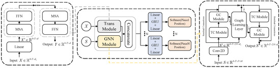 Given the crucial role of transformers in handling sequence data and the effectiveness of GNNs in processing spatial data, we now present the location prediction model for wargaming that leverages transformers and GNNs as core modules. Figure 2 illustrates the architecture of the proposed ELP-Net for wargaming. In this framework, the input attribute vector is denoted as , where T represents the length of the sequence, b is the batch size, and denotes the dimension of the input feature. The spatial tensor is represented as , where is the size of the spatial tensor, and corresponds to the total number of hexagonal grids on the map. The transformer module consists of linear layers, multi-head self-attention (MSA) mechanisms, and position-wise feed-forward (FFN) networks. The GNN module is structured with a Conv2D, a graph learning layer, temporal convolution (TC) modules, and graph convolution (GC) modules. After concatenating the transmissions of the spatial and attribute features, the network is divided into N blocks, each with the same architecture. To preserve temporal feature information, we utilize a gated recurrent unit (GRU), a variant of recurrent neural networks that is designed to manage information flow through update and reset gates. Finally, a fully connected layer of size M, followed by a softmax layer, is used to generate the output tensor for each piece.