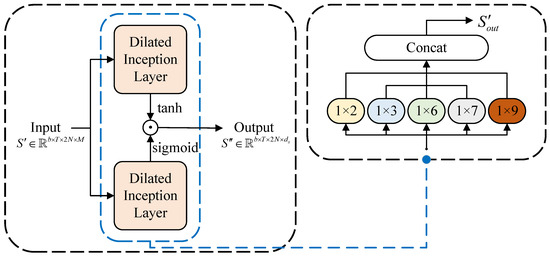 The temporal convolution module consists of two dilated inception layers [38], each containing a series of standardized one-dimensional convolution filters. One layer employs a hyperbolic tangent (tanh) activation function, serving as a filter to extract high-level temporal features. The other layer utilizes a sigmoid activation function, acting as a gating mechanism to regulate the flow of information from the filter to subsequent modules. This dual-layer structure enables the module to balance feature extraction and information flow effectively. The architecture of the temporal convolution module is illustrated in Figure 3.