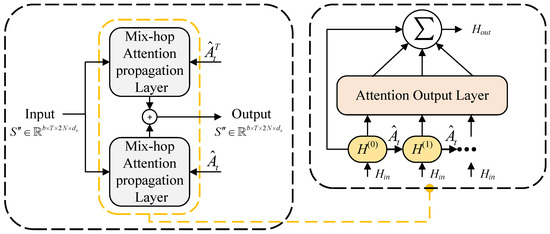 The new mix-hop attention propagation layer in this module includes two steps: information propagation and information selection. The information propagation step is formulated as follows: