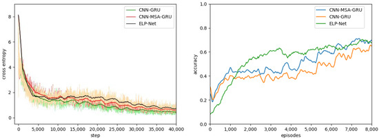 Based on the wargaming dataset, we trained three network models: CNN-GRU, CNN-MSA-GRU, and ELP-Net. Figure 5 illustrates the comparison of their training results, including the loss and accuracy curves recorded after each mini-batch. In the left panel, the loss values of all models are shown per training step, while the right panel presents accuracy values, which are calculated every 10 time steps as one episode. From the figure, it is evident that the loss curves for all models converge over time, demonstrating stable training. The ELP-Net model exhibits a slightly higher loss during training, likely due to the integration of the GNN and transformer modules. These components significantly improve model capacity but at the cost of increased complexity. Consequently, ELP-Net achieves the highest accuracy among the three models, benefiting from its ability to capture both spatial and temporal dependencies effectively.