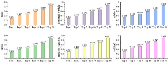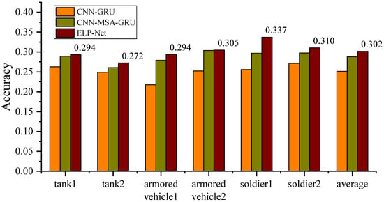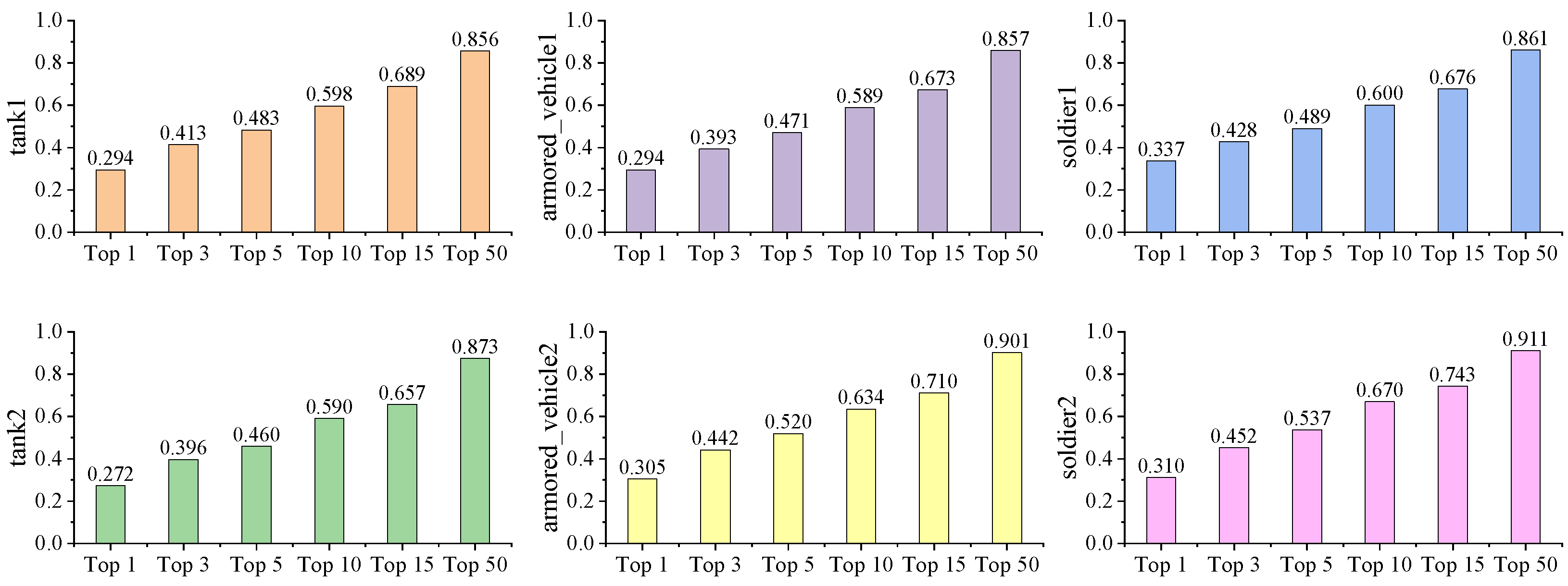 Firstly, we tested the ELP-Net under optimal verification parameters and selected the highest accuracy as the baseline result. Figure 6 presents the top 1, top 3, top 5, top 10, top 15, and top 50 prediction accuracy for all pieces using ELP-Net. Overall, the results reveal that the soldier2 piece consistently achieves the highest accuracy across all top-x levels, followed by the armored vehicle2 pieces, with the tank1 pieces exhibiting the lowest accuracy. From an operational perspective, this pattern aligns with the actual complexity of the battlefield. Soldier pieces are more dynamic and likely engage in smaller areas, making them easier to predict accurately. In contrast, tank pieces operate over larger areas with more significant movement restrictions, resulting in greater prediction uncertainty. Similarly, armored vehicle pieces exhibit intermediate accuracy, reflecting their moderate maneuverability and constrained operational zones.