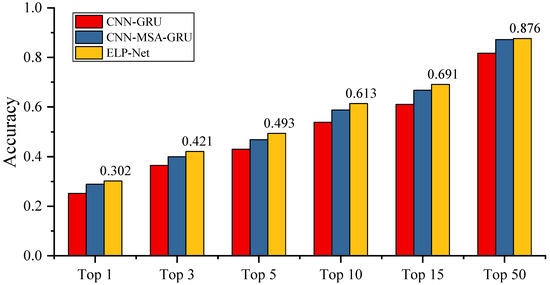 To evaluate the prediction accuracy of ELP-Net, we use a performance metric that measures the probability of the ground truth labels falling within the top 1, 3, 5, 10, 15, and 50 hexagonal grids with the highest predicted probabilities. This provides a comprehensive assessment of the model accuracy across varying levels of prediction confidence. For model training, the ADAM optimizer [39] is employed to ensure efficient and stable convergence. The main hyperparameters used in the training process are summarized in Table 2. Further details on the implementation are provided in Appendix B.