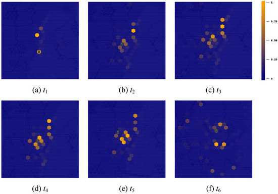 In Figure 9, the location prediction heatmap generated by the ELP-Net model and the actual locations of the tank2 piece in different time periods are presented. The predicted probabilities of enemy locations are normalized to the interval to represent their likelihoods. The actual locations of the piece, represented as a green tank on the map, correspond to the true positions in the wargame. As time goes by, the activity range of the tank gradually expands. This is reflected in the heatmap by the increasing number of lighter-colored hexagonal grids, indicating a wider distribution of predicted probabilities. At time , the prediction accuracy was the highest as the tank was more stationary and its location was easier to predict. However, as the tank moved further and its operational range broadened, the distribution of predicted probabilities became more dispersed, leading to a decrease in prediction accuracy.