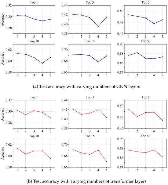 For the GNN module, the number of transformer layers was fixed at 1, and the number of GNN layers was varied from 1 to 5. The results (Figure 10a) show that using a single GNN layer achieves the best performance across most top-x levels. However, for broader prediction ranges like top 15 and top 50, a depth of two layers yields slightly better accuracy. This suggests that, for more localized predictions, a single layer is sufficient to capture the spatial relationships effectively, while additional layers provide a benefit when broader contextual information is required. For the transformer module, we fixed the number of GNN layers at 1 and varied the number of transformer layers from 1 to 5. The general trend, as presented in Figure 10b, showed a decrease in accuracy as the number of layers increased. A single transformer layer achieved optimal performance for most top-x levels, while for top 3, top 15, and top 50, a depth of four layers delivered comparable results. This could be attributed to the model ability to capture longer temporal dependencies at these specific prediction levels when additional layers are used. However, beyond this, the increased complexity likely leads to overfitting and diminished performance.