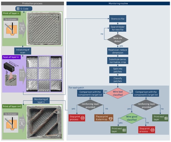 Additive manufacturing is gaining importance in a number of application areas, and there is an increased demand for mechanically resilient components. A way to improve the mechanical properties of parts made of thermoplastics is by using reinforcing material. The study demonstrates the development of a monitoring procedure for a fused filament fabrication-based co-extrusion process for manufacturing wire-reinforced thermoplastic components. Test components in two variants are produced, and data acquisition is carried out with a laser line scanner. The collected data are employed to train deep neural networks to classify the printed layers, aiming for the deep neural networks to be able to classify four different classes and identify layers with insufficient quality. A dedicated convolutional neural network is designed taking into account various factors such as layer architecture, data pre-processing and optimization methods. Several network architectures, including transfer learning (based on VGG16 and ResNet50), with and without fine-tuning, are compared in terms of their performance based on the F1 score. Both the transfer learning model with ResNet50 and the fine-tuning model achieve an F1 score of 84% and 83%, respectively, for the decisive class ‘wire bad’ classifying inadequate reinforcement.