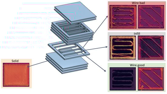 As illustrated in Figure 3, the four classes are made up of a total of seven variants. Two different patterns are printed for the reinforcement layers with wire and the infill structure. The test component is a combination of both variants. As is usual in the application, solid layers are printed first. This is followed by infill layers, which can be reinforced with wire. If co-extrusion does not occur as intended, bad layers are created. These are layers in which the wire does not remain in the desired position. There are many causes behind these failures: