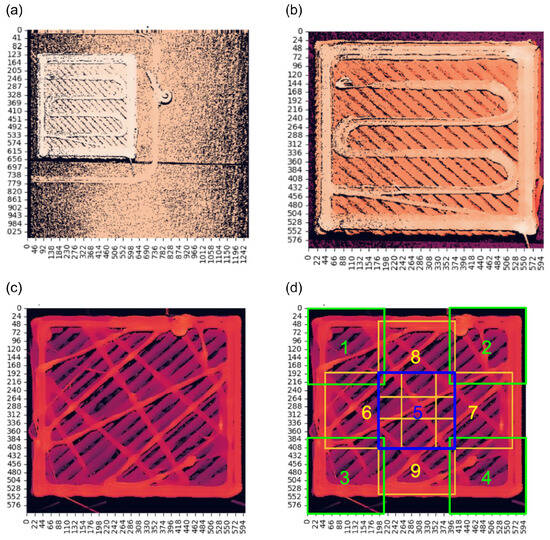 In order to extract a proper amount of information from the image files, the output files are divided into nine different patches (see Figure 4d). The splitting is convenient as common transfer learning models do not operate with 600 × 600 pixel data, as given by the images prior to splitting, and in addition, a higher number of image instances are made available for the learning approach, which can always be beneficial in training ANN models. A frequently used image resolution in ANN applications is 224 × 224 pixels. Splitting allows to increase the total number of samples and therefore also the number of samples per class. However, it is important to verify and adjust the class labels of the cropped image tiles according to the visual information in the particular image patch.