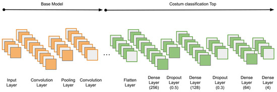 In its first few layers, which are close to the input, a CNN is designed to detect simple general features such as edges and corners. In the following layers, these features are combined to form high-level feature detectors. These are responsible for recognizing more complex and domain-specific features. Therefore, a model trained on general data can be used as a starting point for specific tasks to be trained. In this respect, robust models can be trained with limited datasets by truncating the fully connected (FC) layers of the base model and adding an application-specific head [36].