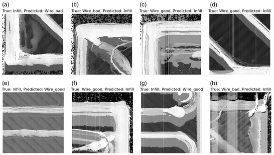 The output dataset consists of the processed scans. Not all scans can be used, as some contain a failure or the quality is insufficient. After processing and splitting the individual scans, the dataset has the extent depicted in Table 4. It can be seen that the dataset is unbalanced, as the classes ‘solid’ and ‘infill’ are comparatively overrepresented, which is due to the fact that ‘solid’ and ‘infill’ layers are consistently printed during printing. The class ‘infill’ is overrepresented in particular with a share of 44.6% of the total dataset. It is technically not feasible to reinforce each layer with wire, so that regular infill layers are constantly printed in between. If a print fails, this is typically attributable to the reinforcement layers, but this does not apply to the ‘infill’ and ‘solid’ layers, where issues occur less frequently. The target of 100 images for the class ‘wire good’ before data processing was not fulfilled, which is a result of technical difficulties.