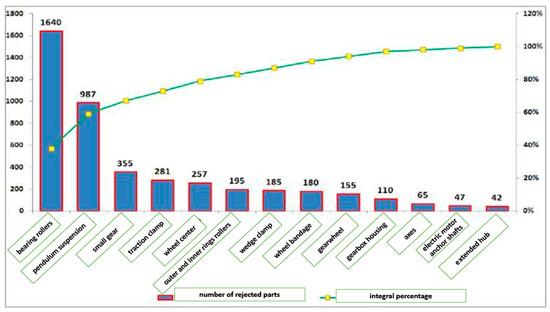 One of the options for assessing the technical condition of locomotive units and assemblies based on the results of non-destructive testing is to use Pareto analysis [9,18]. Analysis of the obtained Pareto diagram makes it possible to determine that the most prevalent components in the rejection of electric locomotive parts of the 3VL-80s series are the bearing rollers of the axle box assembly, pendulum suspensions, and small gears of the traction transmission (Figure 1).