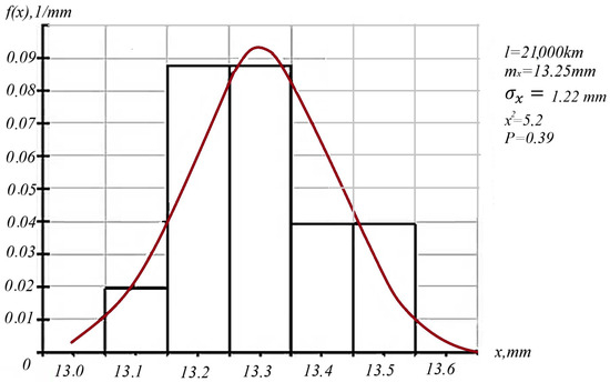 The methodology and algorithm for determining the compliance of samples of controlled parameters with the assumed distribution laws were developed and described in [9,10,11,19,20]. To check the compliance of a sample with the assumed theoretical distribution law, one can use one of the known criteria, for example, the Pearson goodness-of-fit criterion. It allows one to determine the probability that, due to random causes, the measure of divergence between the theoretical and statistical distributions will be greater than the actually observed one [19]. The samples of the controlled parameters of wear parts correspond to the normal distribution law. The distribution density for this law is as follows: