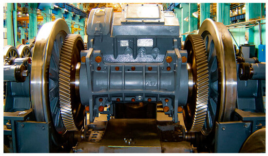 We have conducted surveys of the traction transmission of VL-80s electric locomotives on emerging breakdowns and failures from 2017 to 2023, according to Uzbekistan depot data. The gearing of VL80-c electric locomotives is rigid, double-sided, helical, and consists of two gears and two pinions enclosed in pairs in a protective casing. Figure 3 shows the wheel-motor block (WMB) of a VL-80s electric locomotive with a double-sided helical gear with an all-roller gear.