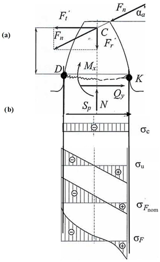 Figure 4 shows that the force causes transverse bending of the tooth and the force causes compression of the tooth. Thus, in the dangerous cross-section of the tooth (in the stem at the transition point of the involute to the tooth flange) there are three internal force factors: bending moment Mx, transverse force Qy and longitudinal force Nz.